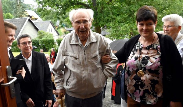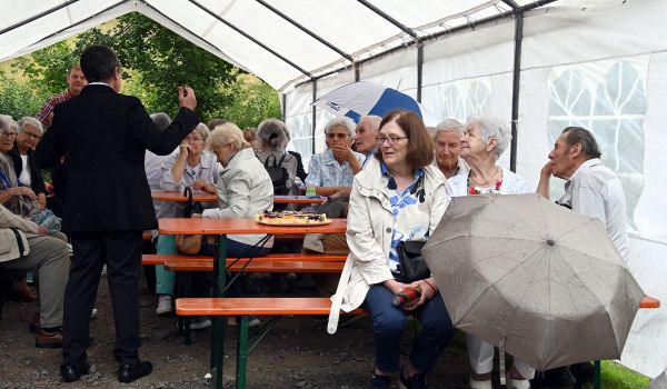 An den Feierlichkeiten nahm auch der 101-jährige Otto Müller, genannt „Ottl“, teil. Er wurde einst als einer der ersten in der Haselbacher Kapelle getauft und durfte zum Fest die Jubiläumstorte anschneiden. Fotos: Stadt Sonneberg/C.-H. Zitzmann -