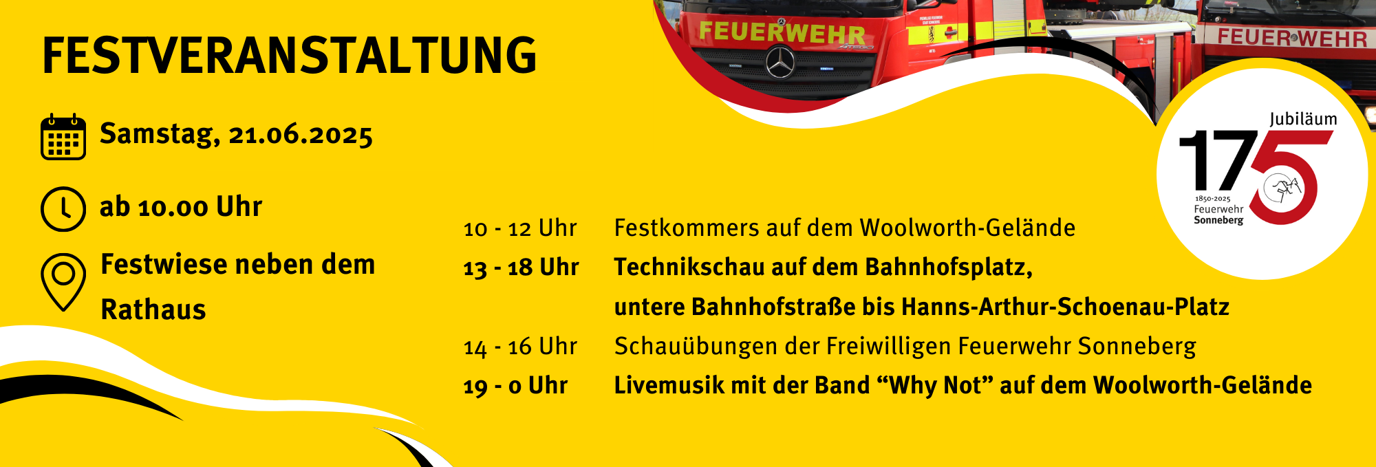 Am Samstag, den 21. Juni 2025, lädt die Freiwillige Feuerwehr Sonneberg alle Bürgerinnen und Bürger zur großen Festveranstaltung anlässlich ihres 175-jährigen Bestehens ein. Die Feierlichkeiten finden auf der Festwiese neben dem Rathaus sowie auf dem Gelände rund um den Bahnhof und die Bahnhofstraße statt. Der Festtag beginnt ab 10:00 Uhr und bietet ein buntes Programm für Jung und Alt.