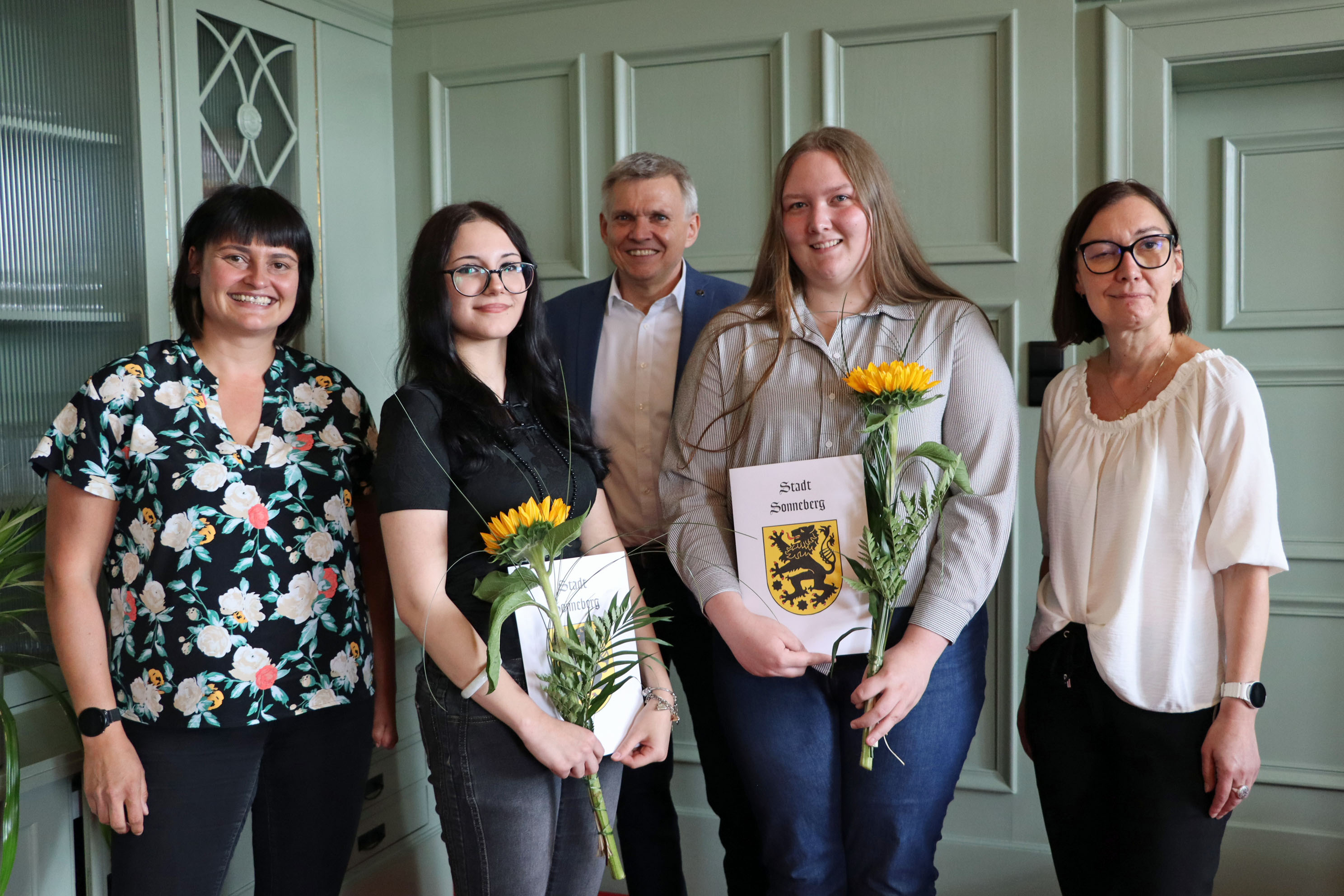 Pünktlich zum 1. August 2025 haben zwei neue Auszubildende in der Stadtverwaltung Sonneberg angefangen. Leoni Aumüller aus Föritztal und Lily Speer aus Sonneberg erlernen nach dem Abitur bzw. nach der Mittleren Reife nun in einer dreijährigen, dualen Ausbildung den Beruf der Verwaltungsfachangestellten und wurden von Bürgermeister Dr. Heiko Voigt sowie Vertretern der Personalabteilung und des Personalrates im Rathaus herzlich willkommen geheißen.