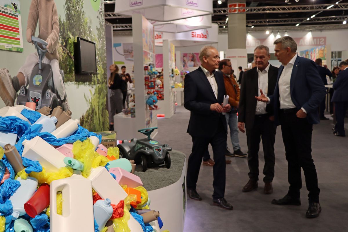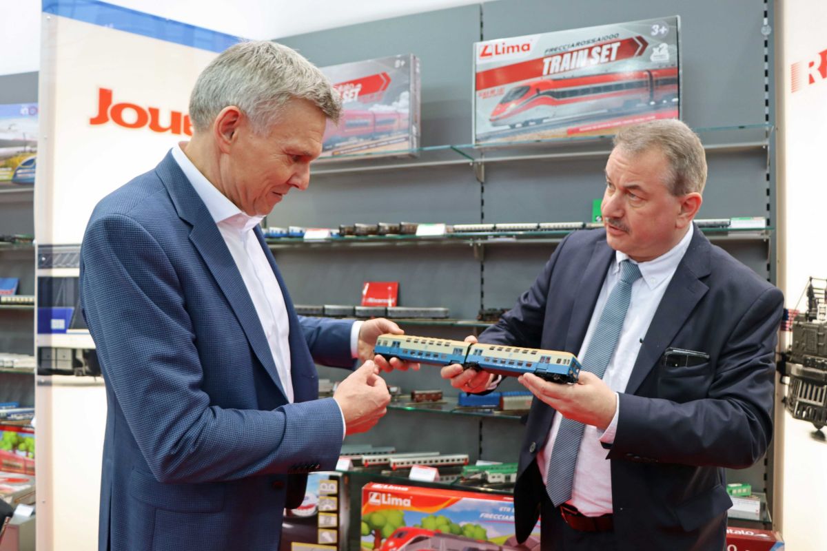Am Stand der SIMBA-DICKIE-GROUP GmbH kamen Sonnebergs Bürgermeister Dr. Heiko Voigt und Neustadts Oberbürgermeister Frank Rebhan ins Gespräch mit dem Finanzgeschäftsführer Manfred Duschl. Das familiengeführte Haus vereinigt mittlerweile mehr als 20 namhafte Marken aus aller Welt unter sich, darunter BIG, Majorette, Marvel, Carson, Smoby, Corolle, Schuco, Tamiya und weitere Spielzeughersteller. Autos, Roller, Puppen – soweit das Auge reichte. Auf einer Ausstellungsfläche von insgesamt 2.500 Quadratmetern verteilt über vier Hallen zeigte die SIMBA-DICKIE-GROUP Flagge. Unter anderem in der Halle der Modellbahnhersteller. Denn auch Märklin, einst mit eigenem Produktionsstandort in Sonneberg, ist jetzt in den Händen des Global Players. Mittlerweile fahre man mit der Marke aus Göppingen wieder stabile Zahlen ein, berichtete der Niederlassungsleiter vom Standort Sonneberg, Norbert Pillmann. Ziel sei es, das junge Publikum wieder an das Thema Modelleisenbahn heranzuführen. „Bei Kindern kann man nicht mit einer Lok für 500 Euro anfangen“, so der Spielzeugexperte. Vielmehr setze man auf Individualität und auf Modellwagen, die von Künstlern gestaltet wurden und als Sondereditionen verkauft werden. An den Tischen der Märklin-Bahnen herrschte ordentlich Betrieb. Der ICE, der um eine winterliche Stadt rauschte, war beliebtes Fotomotiv der Messebesucher. Laut einer aktuellen Pressemitteilung der SIMBA-DICKIE-GROUP GmbH beläuft sich der Eigen-Produktionsanteil der gruppenzugehörigen Produktionsstätten in Frankreich, Deutschland, Thailand und Spanien auf 40 Prozent. Dieser solle perspektivisch gesteigert werden.