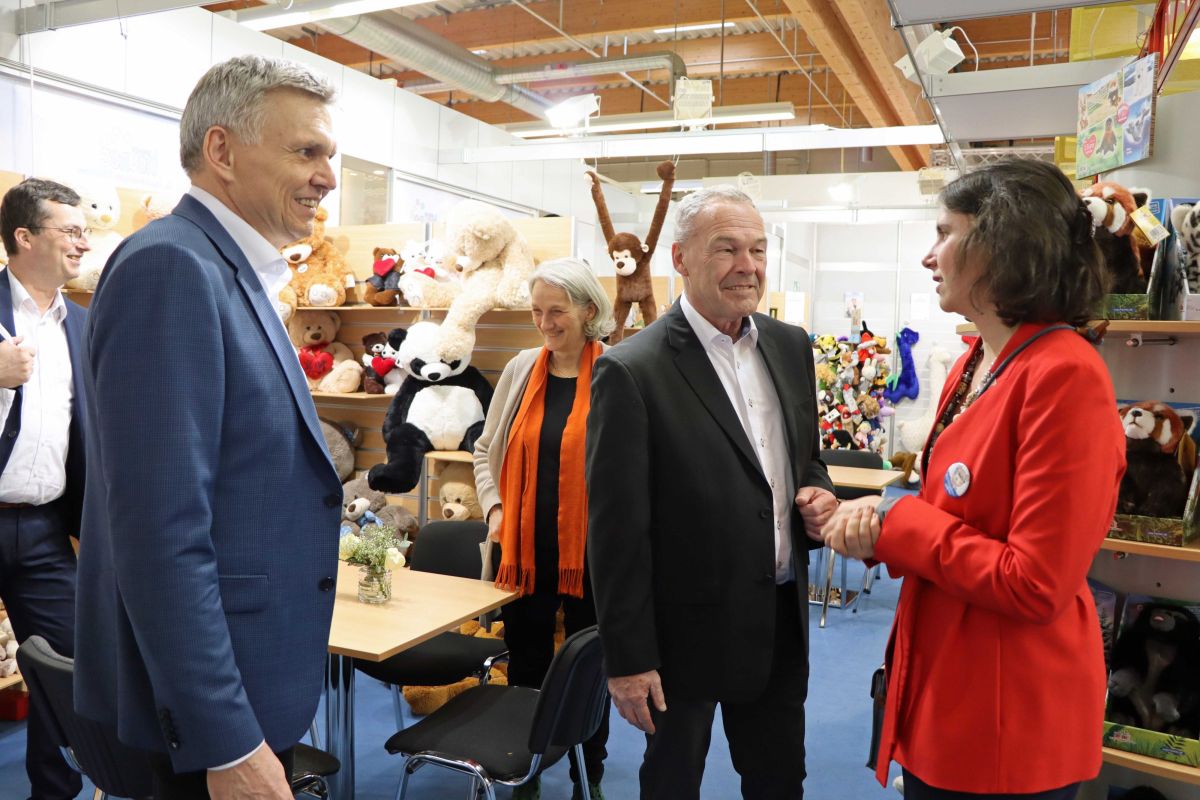Anfassen ausdrücklich erwünscht: Am Stand der Heunec Plüschspielwarenfabrik GmbH & Co. KG in Halle 12 der Nürnberger Spielwarenmesse wurden die Besucher von Kuschelagenten und einem sehr vielseitigen Sortiment begrüßt, das zum Streicheln und Knuddeln einlud. Vom Wald- bis zum Wüstentier, vom Sandmännchen bis zum beliebten Bären „Paddington“, vom haptischen Baby-Spielzeug bis zum großen Kuschelhund blieb kein Wunsch offen. Geschäftsführerin Josephine Dransfeld hatte alle Hände voll zu tun, denn das Publikum gab sich die sprichwörtliche Klinke in die Hand. Am zweiten Messetag kamen auch Neustadts OB Frank Rebhan und Wirtschaftsförderin Sandra Franz sowie Sonnebergs Bürgermeister Dr. Heiko Voigt und Wirtschaftsförderer Marco Kuhnt auf eine Stippvisite vorbei.
