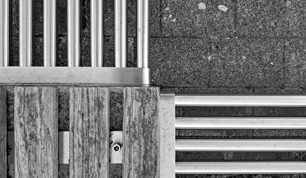 Eine schlichte Sitzgelegenheit aus Metall und Holz von oben fotografiert gibt ein geometrisches Muster, wahrscheinlich eher unscheinbar, wenn man täglich daran vorbeigeht oder sich dort hinsetzt. Foto: Fotoclub70 -
