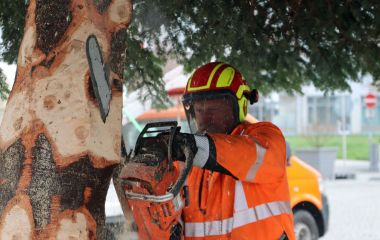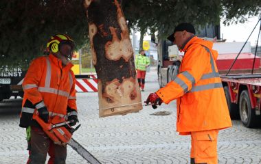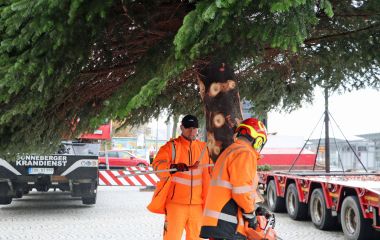 Kein Scherz: Noch bevor die Narren am 11.11. um 11.11 Uhr das Sonneberger Rathaus stürmten, hat der Bauhof den ersten Weihnachtsbaum dieses Jahres auf dem Bahnhofsplatz postiert. Eine 11 Meter hohe, ganz ebenmäßig und dicht gewachsene sowie 1,4 Tonnen schwere Nordmanntanne aus Neuenbau war von einem Schwerlasttransport angeliefert, mit der Motorsäge am Stamm in Form gebracht und per Kran in die Hülse inmitten des Bahnhofsplatzes gesetzt worden. Keine Stunde dauerte das Schauspiel, das auch viele Passanten anlockte. Gesponsert hat den wunderschönen Baum – selbst die aufgestellten Weihnachtsbäume auf dem Erfurter Domplatz und vor dem Alten Rathaus in Leipzig können in diesem Jahr nicht mithalten – eine Familie aus dem Föritztal-Ortsteil.