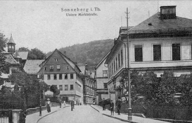 Das Neue Rathaus wurde zwischen 1927 und 1928 nach Plänen des Stadtbaudirektors Karl Dröner errichtet. Aufgrund der Industrialisierung vervierfachte sich die Einwohnerzahl zwischen 1840 und 1910. Die Sonneberger Spielwarenindustrie gewann weiter an Bedeutung. Das Rathaus in der Oberen Stadt erwies sich bald als zu klein. Nachdem die Sonneberger Spielwarenindustrie während des Ersten Weltkrieges einen deutlichen Einbruch erlebte, kam es in den 1920er Jahren zu einer erneuten Blütezeit, die auch in der Errichtung bedeutender öffentlicher und unternehmerischer Bauten ihren Niederschlag fand. Rechts im Bild befindet sich das ehemalige US-Handelshaus Woolworth, welches 1925 gebaut und 1945 zerstört wurde.