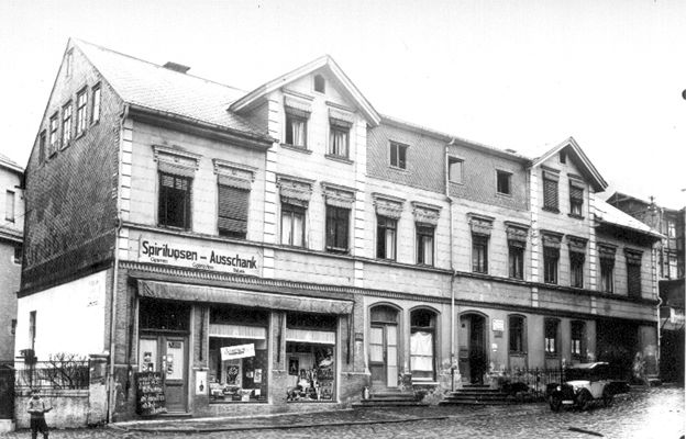Das frühere Geschäfts- und Lagerhaus der Spedition Matthäus Hofmann & Co. wurde zwischen 1922 und 1923 nach einem Entwurf der Sonneberger Architekten Franz Boxberger und Ernst Herbart errichtet. Anfangs war hier das US-Einkaufshaus J. Halpern & Co. mit einer Niederlassung vertreten. 1926 erwarb eine Krankenkasse das Gebäude zur Nutzung als Geschäftssitz und beauftragte den Sonneberger Architekten Walter Buchholz mit dem Umbau. Dieser entsprach weitgehend der heutigen Bausubstanz. Zusammen mit dem benachbarten Postamt von 1932 (Baustil: Neues Bauen), dem Neuen Rathaus sowie dem gegenüberliegenden, heute nicht mehr existierenden, Einkaufshaus der Fa. Woolworth (USA) empfing den Ankommenden beim Heraustreten aus dem Bahnhofsgebäude ein großstädtischer Anblick.
