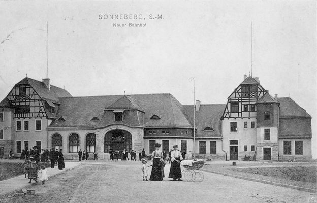 Statt des 1858 errichteten Bahnhofes entstand zwischen 1905 und 1907 ein neuer moderner Personen- und Güterbahnhof. Wegen des gestiegenen Güterverkehrs, der wachsenden Einwohnerzahl Sonnebergs sowie neuer Eisenbahnverbindungen ins Umland war der Neubau dringend notwendig geworden. Der neue Bahnhof entwickelte sich zum Spielwaren-Umschlagplatz. Vom dortigen Güterbahnhof wurde bis in die zweite Hälfte des 20. Jahrhunderts der größte Teil der in und um Sonneberg hergestellten Spielwaren in alle Welt versandt. Lange Zeit prägten Fuhrleute und Frauen mit großen „Huckelkörben“, die neben den Spielwaren auch Glaserzeugnisse aus Lauscha lieferten, das Bild des Bahnhofsalltags.