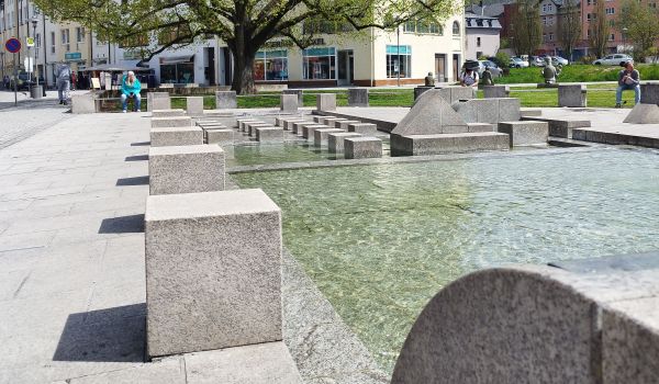 Dann entfaltet das Licht im Brunnen und in der Umgebung seine Wirkung und der ganze Platz ist eine Augenweide.