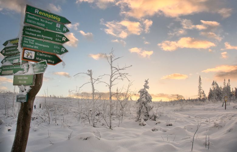 Achtung: Vom Berggasthof "Brand" aus nutzen Sie den Skiwanderweg Rennsteig. Ab der Laubeshütte oder dem Skifahrerdenkmal haben Sie Anschluss an den Skiwanderweg "Glühweinloipe" (4,2 km).