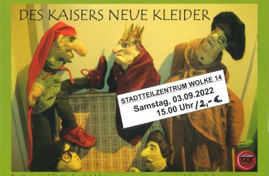 „Des Kaisers neue Kleider“ - Puppentheater in der Wolke14 Am Samstag, 3. September 2022 gastiert um 15:00 Uhr das Theater aus dem Bauch mit Jörg Schmidt im Stadtteilzentrum Wolkenrasen „Wolke 14“. Falls Sie Lust und Laune haben, kommen Sie doch mit Ihren Kindern vorbei und staunen Sie gemeinsam, was sich der Kasper hat einfallen lassen, um seine Gretel heiraten zu können. Aber das ist gar nicht so einfach, denn der Finanzminister Talerklau hat die Steuern erhöht, weil der Kaiser neue Kleider braucht. Und so ist das Geld knapp und die Hochzeit in Gefahr. Doch der Kasper hat für alles eine Lösung. Lassen Sie sich überraschen. „Des Kaisers neue Kleider“ ist ein Puppenspiel für Kinder ab 4 Jahre. Der Eintritt kostet 2, -€. Wir freuen uns auf alle „großen“ und „kleinen“ Besucher. Das Team der Wolke 14