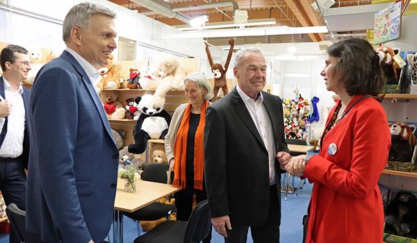 Dr. Heiko Voigt (Bürgermeister der Stadt Sonneberg und Neustadts Oberbürgermeister Frank Rebhan im Gespräch mit Geschäftsführerin Josephine Dransfeld der Heunec Plüschspielwarenfabrik. Fotos: C. Heinkel