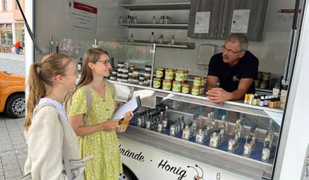 Die Lautertaler Edelbrennerei & Imkerei von Volker und Denise Meyer ist seit Kurzem neben dem Neustadter Markt auch auf dem Sonneberger PIKO-Platz donnerstags präsent. Magdalena Relle (Zweite von links) von der cima und Mayandra Pogodzik befragen den Händler zu seinen Erfahrungen. Foto: S. Bähring