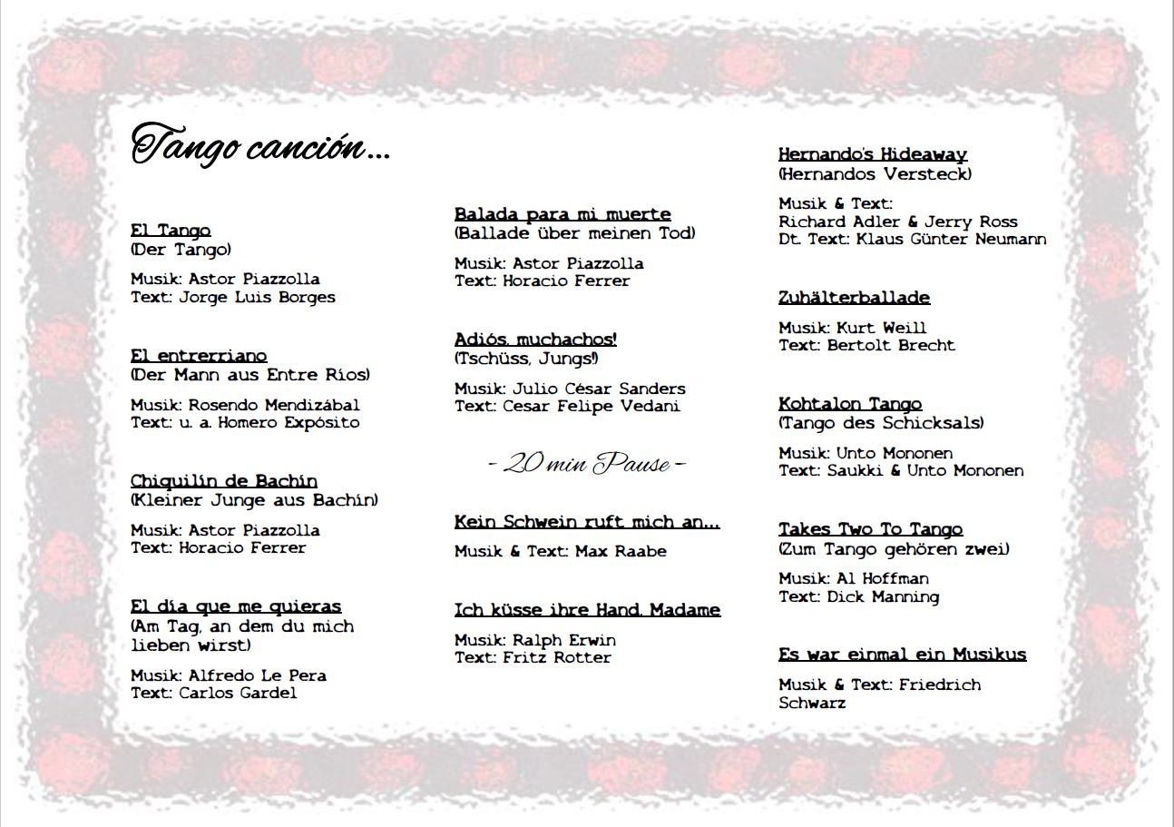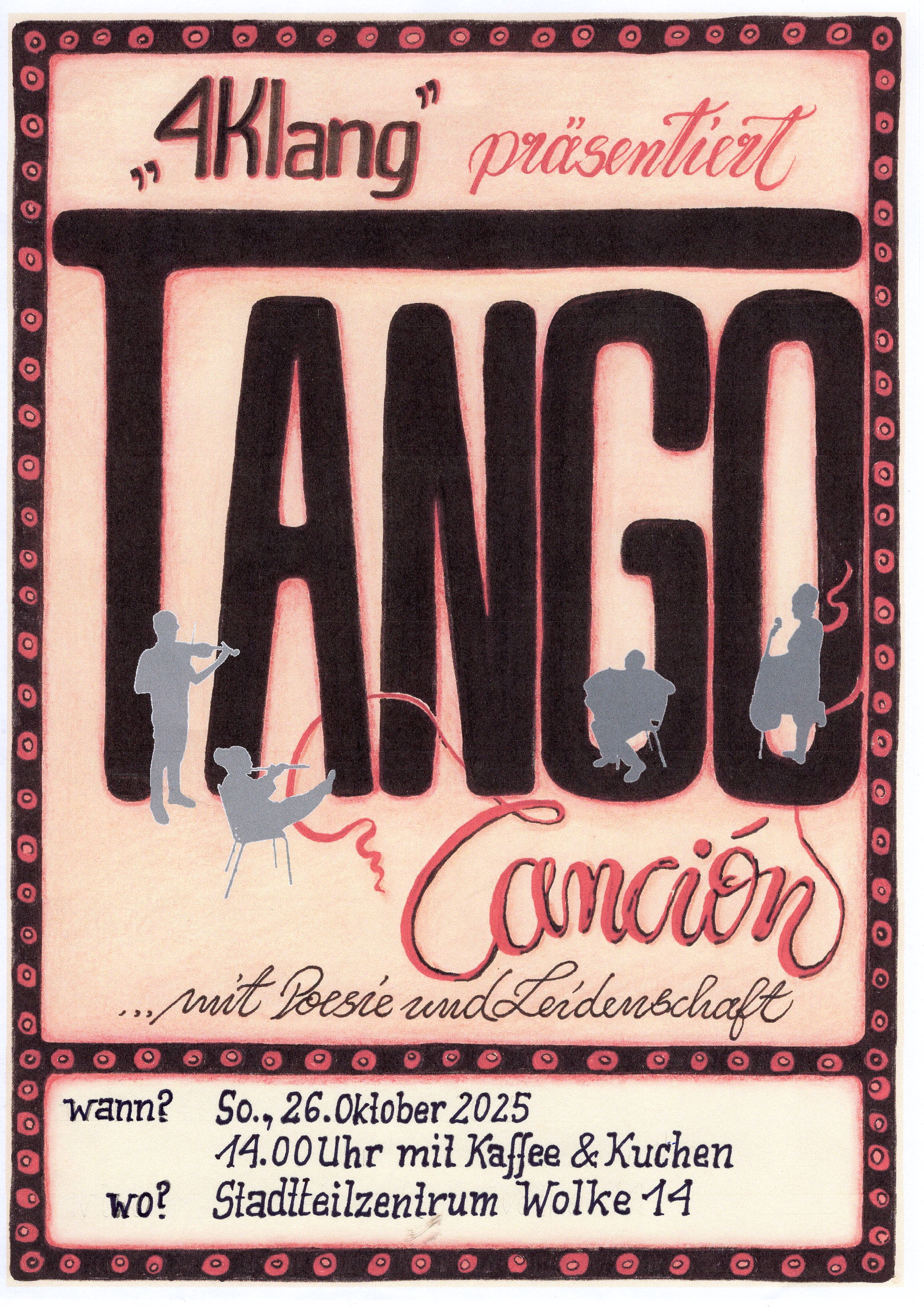 … mit Poesie und Leidenschaft“ lautet der Titel des aktuellen Programms der Gruppe „4Klang“. Das Quartett der Musikschule, bestehend aus Juliane Hoffmann, Annette Walther, Aaron Heinrich und Roland Brehm, nimmt alle Zuhörer mit auf eine musikalische Spurensuche entlang der Geschichte des Tango-Liedes. Neben bekannten Hits und wahren „Klassikern“ kommen dabei auch selten zu hörende Tango-Texte zu Gehör.