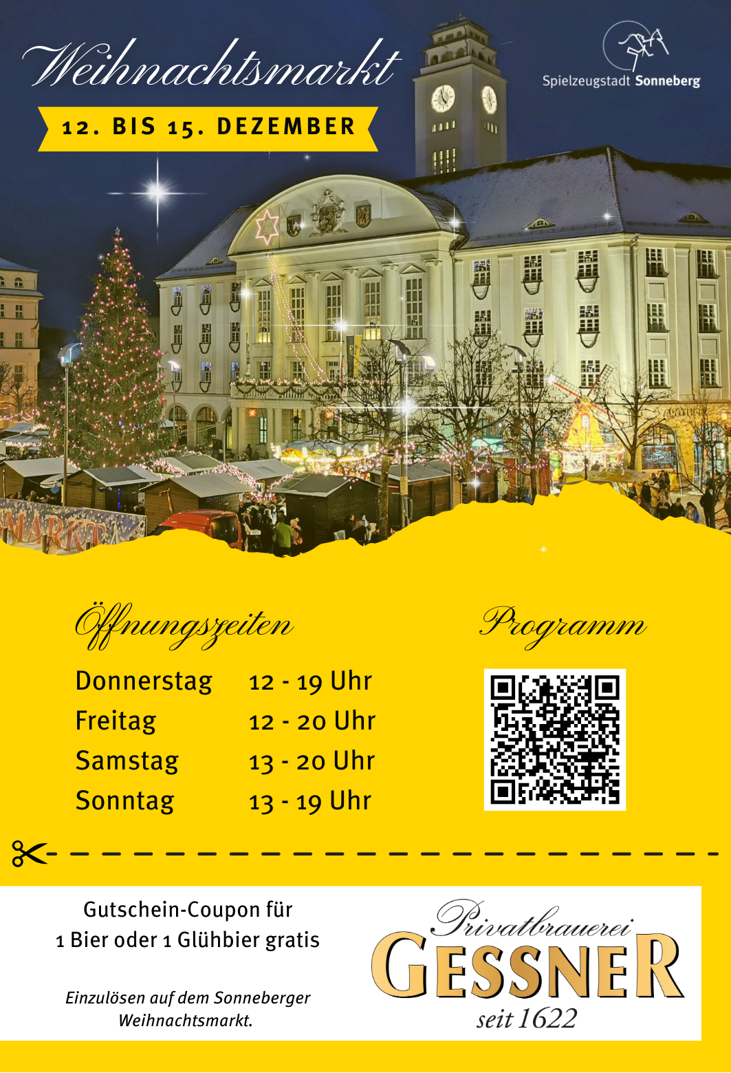- 16:00 Uhr: Eröffnung des Sonneberger Weihnachtsmarktes mit dem Bürgermeister Dr. Heiko Voigt und dem Christkind auf der Bühne