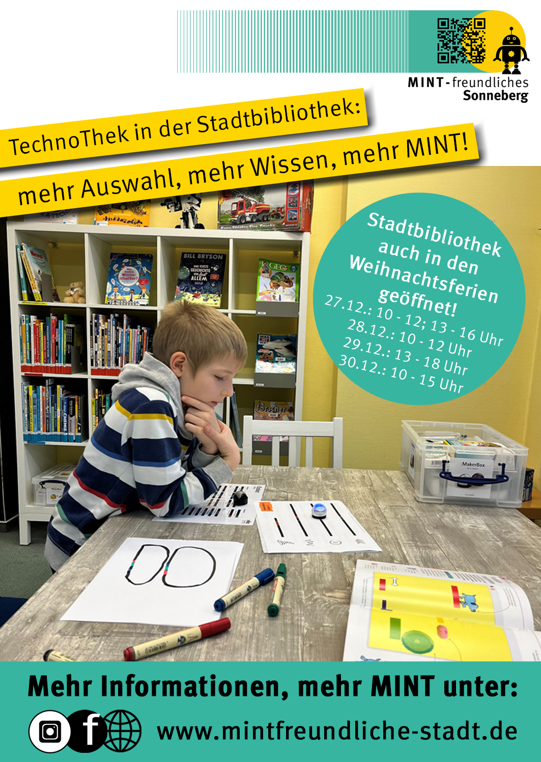 Die Stadtbibliothek bietet am 25. Juli und am 8. August jeweils zwischen 10:00 Uhr und 11:30 Uhr eine MINT-Aktion „Erforsche den Weltraum mit der MINTerstellar-Rallye“ für Kinder an. Ausgestattet mit einem Tablett muss jedes Zweier-Team Aufgaben rund um das Thema Weltraum lösen. Dabei kommen Roboter aus der TechnoTHEK in der Stadtbibliothek (MINT-Lernort der Stadt Sonneberg) und spannende Sachbücher zum Einsatz. Die verfügbaren Plätze sind begrenzt (Anmeldung bei der Stadtbibliothek).